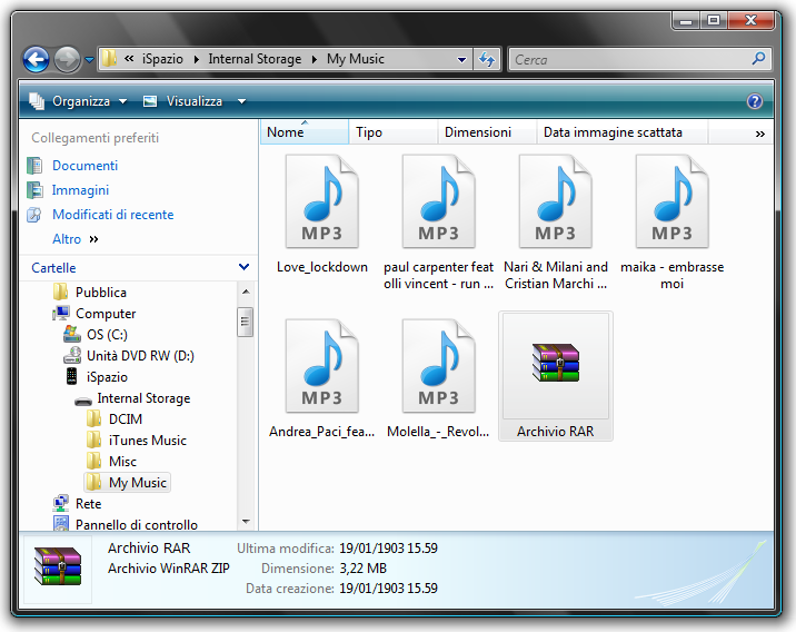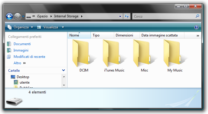 - My Music: questa è la cartella più importante, in quanto ci permette di trasferire sul nostro dispositivo tutta la nostra musica con un semplice Drag&Drop. Potremo inoltre usare questa cartella per archiviare altri file quali per esempio video e archivi RAR per poi trasferirli da un PC ad un altro;