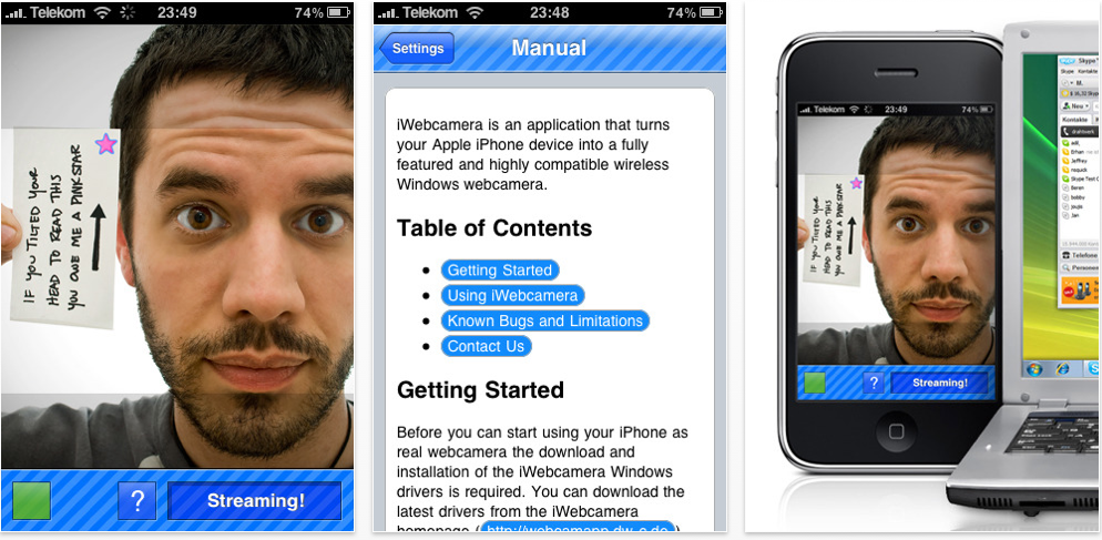 iWebCamera è una nuovissima applicazione che permette di utilizzare la fotocamera del vostro iPhone con una reale webcam per videochattare con programmi come Skype, Windows Live Messenger o altri programmi di messaggistica istantanea.
