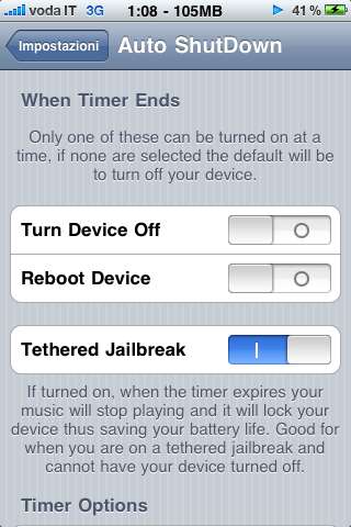 Non avremo alcuna icona, ma potremo trovare l’etichetta del programma nelle impostazioni generali dell’iPhone. Da qui potremo scegliere se desideriamo lo spegnimento del dispositivo, allo scadere del timer, oppure il reboot dello stesso.