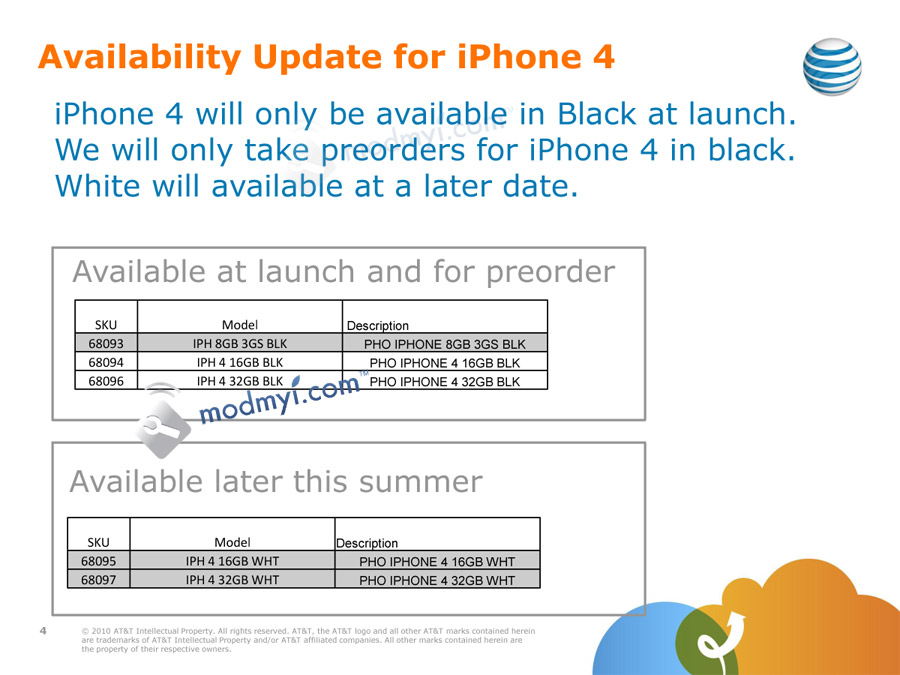 L’immagine che vedete sopra è stata spedita ai dipendenti AT&T, e mostra che l’iPhone 4 verrà inzialmente venduto solamente nella versione nera e che quella bianca arriverà più avanti nell’estate. Questa scelta di Apple sicuramente porterà malumore tra gli utenti che hanno deciso di acquistare la versione bianca, e che probabilmente dovranno aspettare la fine dell’estate per l’acquisto.