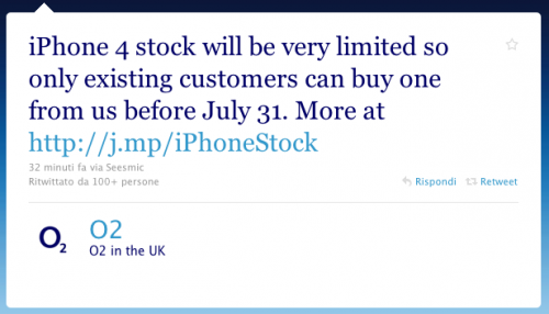 O2 UK ha appena rilasciato un tweet nel quale afferma che a causa delle scorte molto limitate dell’iPhone 4, ha deciso di vendere gli iPhone 4 entro il 31 Luglio solo ai clienti tuttora esistenti.