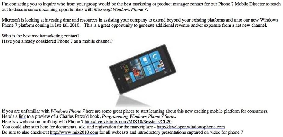 Microsoft sta cercando di investire tempo e risorse per aiutare la vostra azienda ad estendersi oltre le piattaforme esistenti e verso il nuovo Windows 7 Phone, in arrivo nel tardo autunno del 2010. Questa è una grande opportunità per generare entrate supplementari e/o l’esposizione in canali ed ambienti totalmente nuovi.