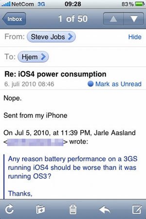 Il nuovo Firmware 4.0 per iPhone rappresenta un’importante aggiornamento per tutti gli utenti a causa dell’introduzione di tantissime novità. Sono proprio queste novità però, che rallentano in maniera considerevole i vecchi 3G suscitando parecchie lamentele da parte degli utenti. Questo però non è tutto in quanto qualcuno ha contatto anche Steve Jobs, sostenendo che dopo aver montato il Firmware 4.0, la batteria dura ancora di meno!