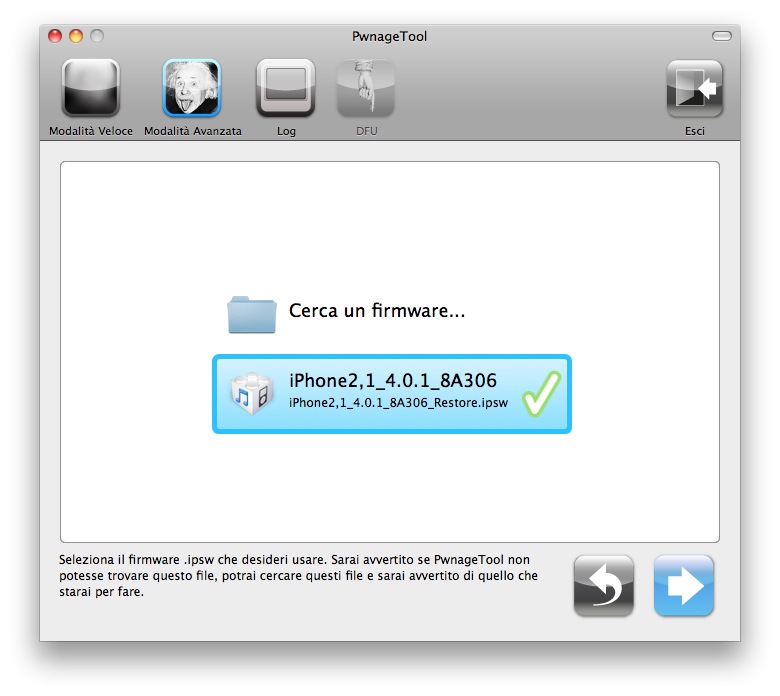 3. Inizierà quindi la ricerca del firmware 4.0.1 originale all’interno del vostro computer. In caso abbiate più firmware salvati nel Mac, assicuratevi di selezionare quello corrispondente alla versione 4.0.1, poi cliccate sulla freccina per continuare