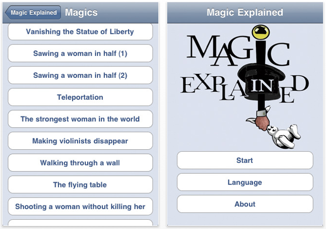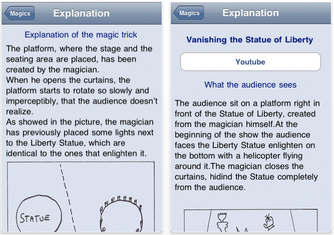 Ogni magia è spiegata nei dettagli ed accompagnata da immagini e video per farvi capire l’esatta procedura per riprodurre il trucco. Questo è l’elenco dei 17 trucchi comprese nell’applicazione: