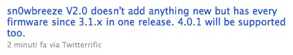 iH8sn0w ha appena annunciato tramite Twitter che è in arrivo una nuova versione di Sn0wbreeze, che permetterà di eseguire il Jailbreak anche su iOS 4.0.1.