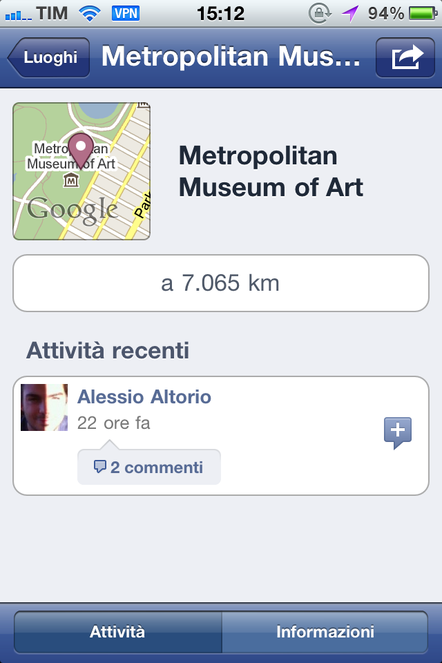 Appena entrati in Luoghi comparirà l’elenco delle persone che già utilizzano il servizio. Un click sul nome vi permetterà di vedere una nuova schermata con tutte le informazioni relative al luogo in cui ci si trova, la distanza rispetto alla vostra posizione attuale e l’iconcina su Google Maps. Potrete anche lasciare commenti e passando alla sezione informazioni, apparirà il numero di connessioni totali che partono da quello stesso luogo, anche se le persone non appartengono alla vostra lista dei contatti.