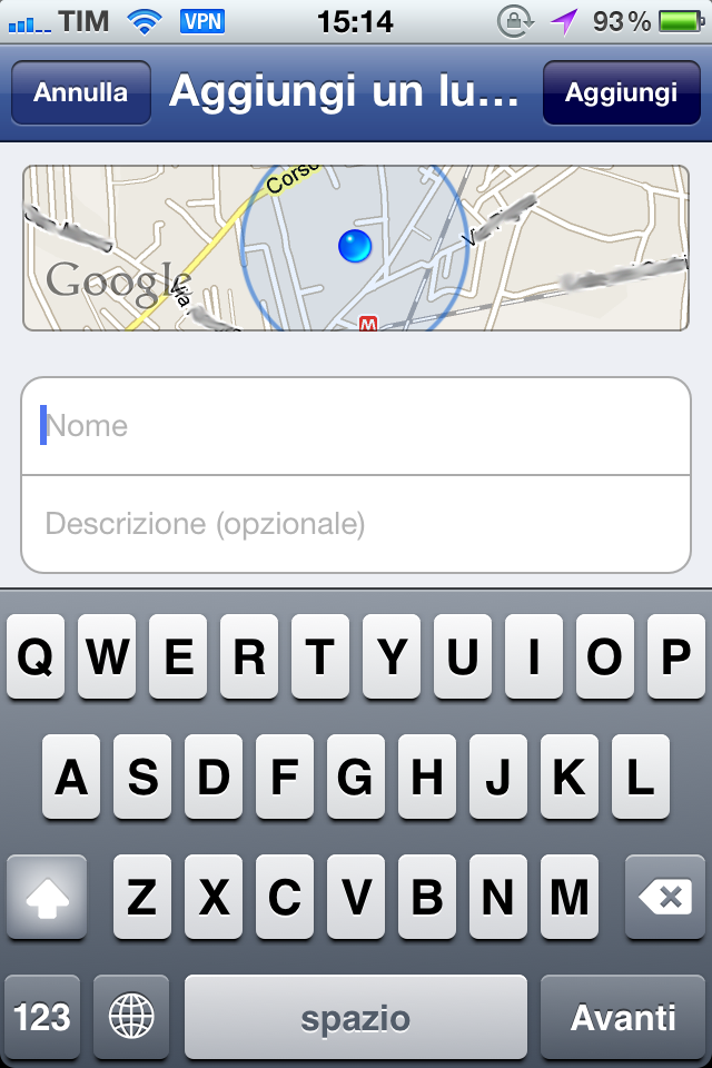 Dalla schermata principale di Luoghi, cliccando sul tasto Registrazione in alto a destra, potremo appunto registrare la nostra posizione attuale per condividerla con gli amici e potremo anche visualizzare una lista di “luoghi vicini”, ovvero tutte le persone che si sono taggate nei pressi del posto in cui ci troviamo in quel preciso momento (a meno di 10km se non erro). Nel mio caso la lista è vuota e quindi posso aggiungere il mio indirizzo cliccando sul “+” in alto.