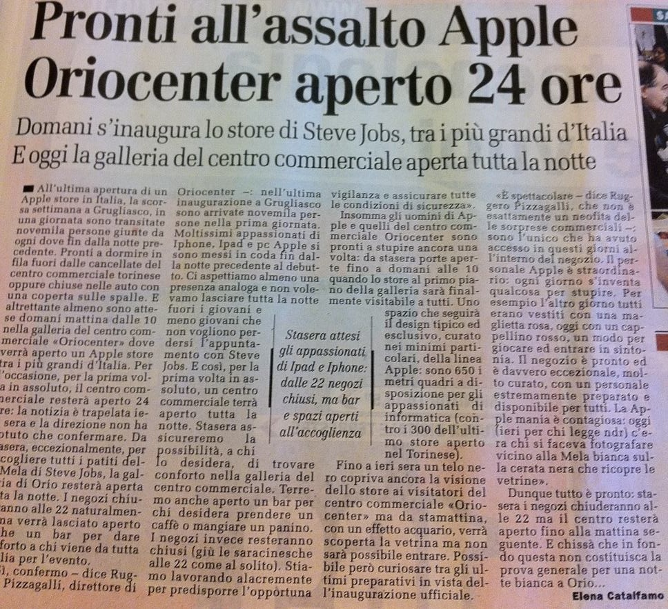 Come ad ogni evento Apple, durante la giornata dell’inaugurazione del nuovo Store di Torino, sono transitate tantissime persone provenienti da tutta Italia, pronte a fare ore di fila ed a dormire fuori dalle cancellate in attesa dell’apertura delle porte dello Store. Altrettante se ne aspettano per domani, sabato 25 settembre, per l’apertura dello Store più grande d’Italia e gli organizzatori hanno deciso di fare una cosa mai fatta precedentemente: il centro commerciale Oriocenter resterà aperto tutta la notte per accogliere tutti i visitatori del nuovo Apple Store.