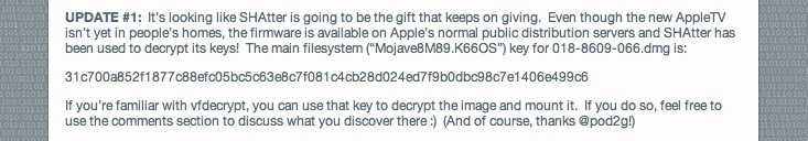 Come vi avevamo anche anticipato gli Hacker non si sono fatti attendere e pare che il DevTeam sia riuscito già a decriptare il nuovo iOS della AppleTV con l’exploit SHAtter ed ha subito pubblicato la chiave per il file system.