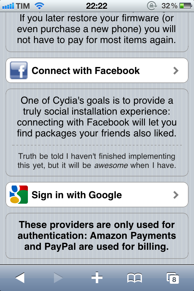 Uno degli obiettivi di Cydia è quello di fornire un’esperienza di installazione veramente sociale: il collegamento con Facebook ti consente di far trovare i pacchetti che ti piacciono a tutti i tuoi amici.