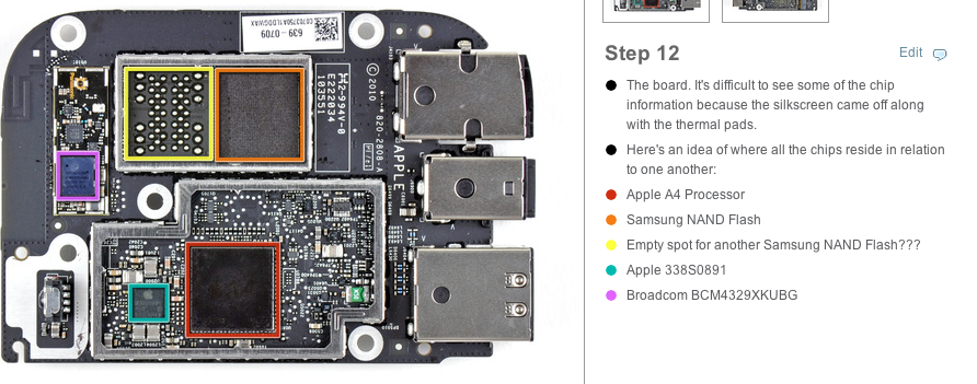 Passando alla memoria, è possibile notare che è presente un solo banco da 256MB, come per l’iPhone 3gs e l’iPod touch 4g. Questo è molto utile per gli sviluppatori che, se in un futuro avranno la possibilità di creare software per il dispositivo, non si troveranno certo a corto di memoria.