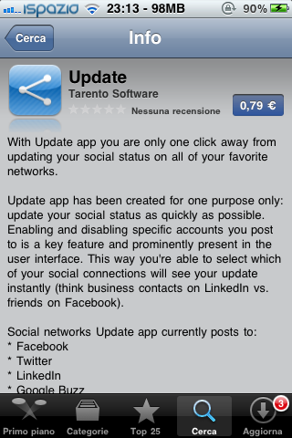 Update è un’applicazione disponibile da pochi giorni in App Store che vi permette, in pochi secondi, di aggiornare lo stato sui vostri social network preferiti tra: Facebook, Twitter, LinkedIn, Google Buzz e Hyves.