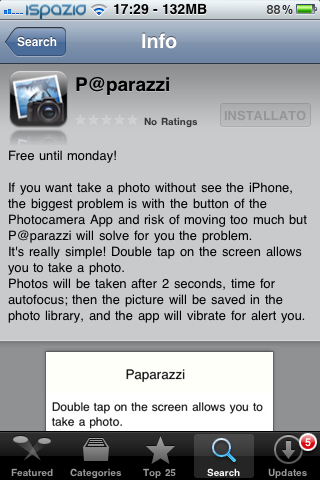 P@parazzi è compatibile con iPhone, richiede iOS 4.1 o successivi ed è localizzata in Italiano e Inglese. L’applicazione resterà gratuita fino a Lunedì prossimo. Trascorso questo periodo, il prezzo sarà pari a 0,79€.