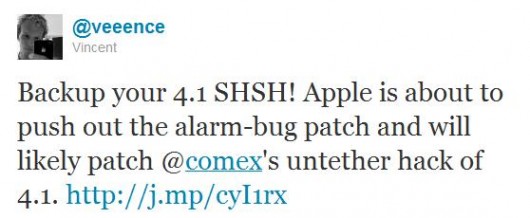 Stando a quanto riportato da un componente dell’Apple Australia, Apple sarebbe in procinto di rilasciare una nuova versione Firmware, che oltre a risolvere un fastidioso problema dell’orologio che si verifica in determinati stati, patcherà molto probabilmente anche l’untethered exploit trovato da comex e usato da GeoHot con Limera1n. E’ essenziale quindi, salvare adesso il certificato SHSH per garantire un futuro downgrade e quindi il Jailbreak del Firmware 4.1.