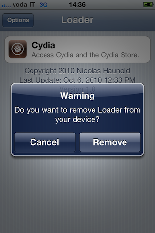 5. Al termine di esso vi verrà richiesto se desiderate rimuovere l’applicazione Loader. Confermate anche in questo caso e chiudete l’applicazione. Verrà automaticamente eseguito un reboot del device ed al termine troverete Cydia sulla SpringBoard.