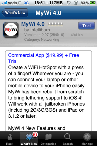 E’ stato appena rilasciato un nuovo aggiornamento per MyWi 4.0, la nota applicazione che ci permette di trasformare il nostro iPhone e iPad in un accessopoint wifi per condividere la nostra connessione 3G con altri dispositivi quali Pc e altri iPhone. Ecco tutti i cambiamenti e le novità: