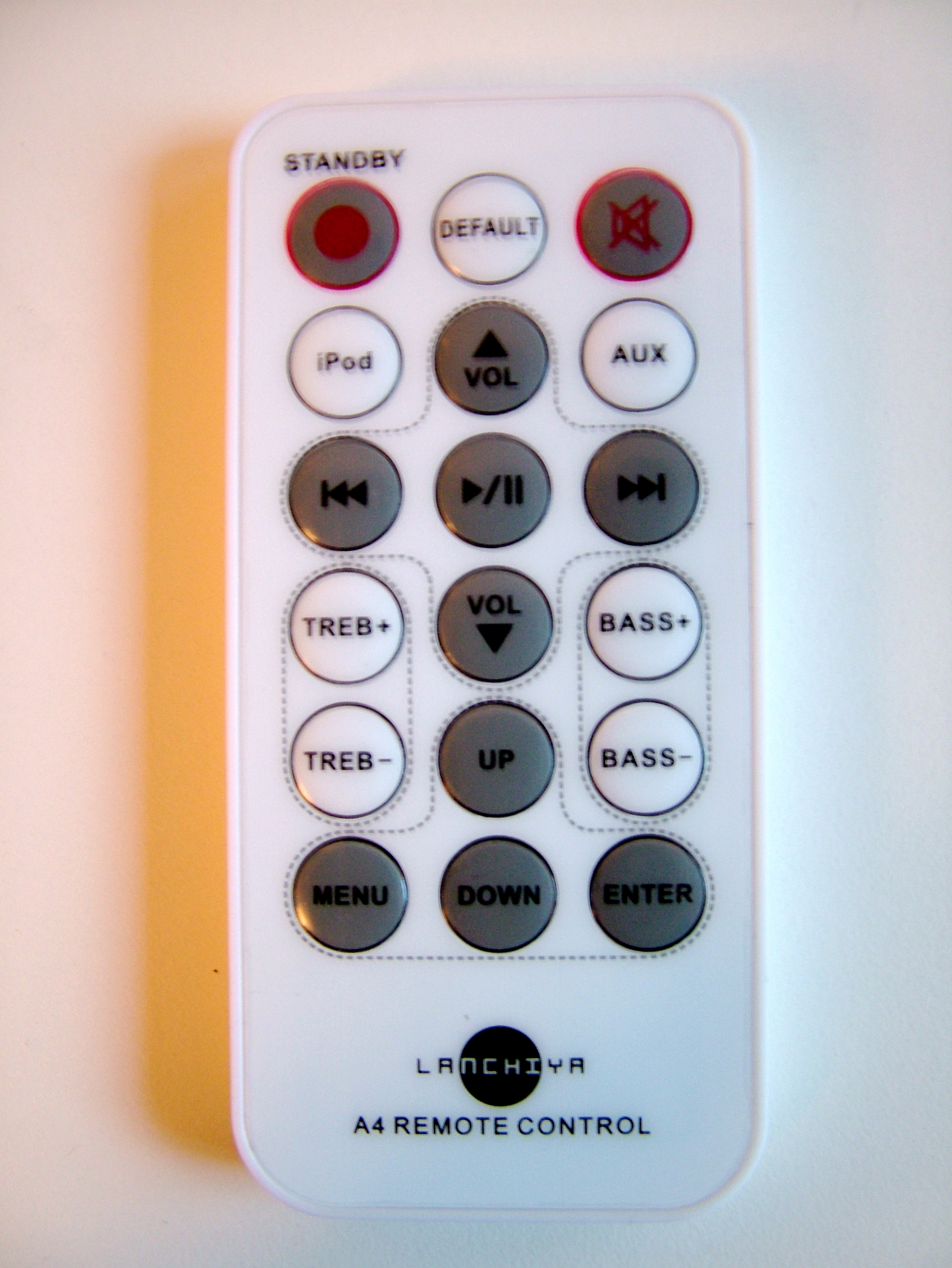 Sul retro invece, in basso, sono posti i comandi di accensione, collegamento per l’alimentazione e della porta per collegare il Jack da 3.5mm incluso nella confezione. Il telecomando IR invece ha la peculiarità, rispetto ai soliti telecomandini a cui siamo abituati, di avere davvero tutte le funzioni disponibili in iPod/iPhone, per un controllo remoto totale del nostro dispositivo. C’è anche la possibilità di aumentare il treble e i bassi dello stesso mi-football, e scambiare il collegamento audio dalla presa AUX all’iPod con un solo click.
