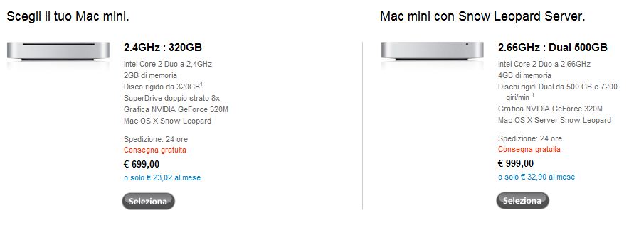 - Mac Mini versione Snow Leopard Server 1149€—->999€