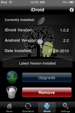 4. Adesso installate iDroid. E’ questo il vero e proprio processo che installerà Andorid OS nel vostro iPhone. La particolarità di Bootlace, oltre all’estrema semplicità di utilizzo, sta anche nel fatto che vi permetterà di aggiornare la versione di iDroid direttamente dall’applicazione, senza ripetere lunghi e difficili procedimenti, bensì cliccando il tasto Upgrade.