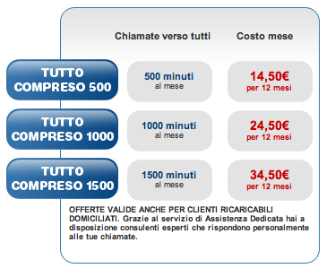 - TUTTO COMPRESO 1500: Con soli 34,50€ al mese hai 1500 minuti verso tutti e con soli 10€ al mese in più per te il nuovo iPhone 4 da 16Gb e 12.50€ per la versione da 32Gb! Dopo il 12esimo mese il costo della promozione passerà da 34.50€ a 69€.