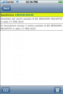 Una volta inserito il codice verrà indicato lo stato della spedizione (accettato, in lavorazione, in giacenza etc.). Ogni codice verrà memorizzato all’interno di iRaccomandata in modo da consultare tutte le volte che si vuole lo stato della spedizione.
