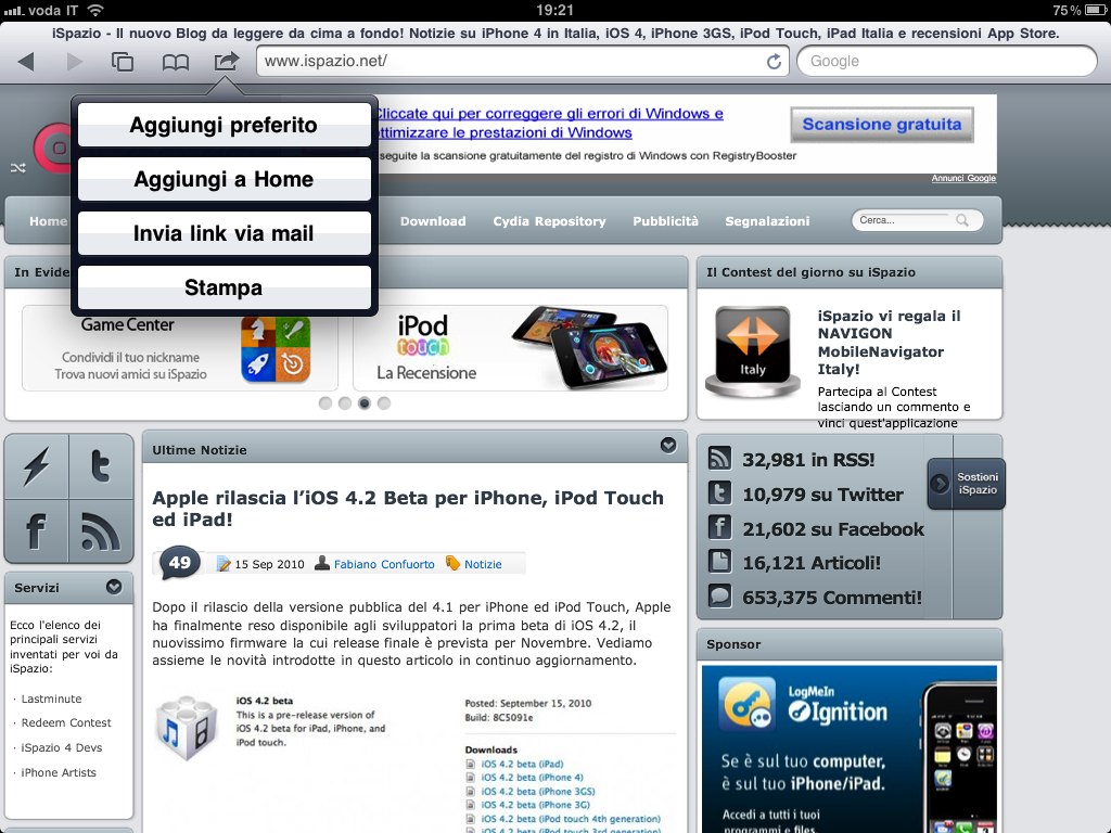 - Cambia il simbolo “+” posto nella barra inferiore al centro. Adesso la nuova icona permette di “Aggiungere il sito ai preferiti”, “Aggiungere il sito alla Home con un icona”, “inviare il link via mail”, e “Stampare la pagina Web” con l’AirPrint