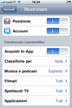 - Tramite le nuove restrizioni, Apple adesso permette all’utente di bloccare la possibilità di installare o disinstallare le applicazioni dell’AppStore. Permette inoltre di bloccare o sbloccare la possibilità di apportare modifiche agli account email.