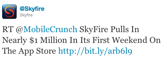 Skyfire nella giornata di ieri tramite un tweet ha affermato di aver ricavato 1 Milione di Dollari dalle vendite, solo nella prima settimana, dell’omonima applicazione.