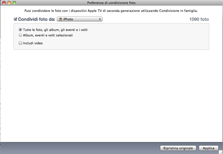 Per attivare la condivisione, basterà entrare nel menù Avanzate (nella menù bar di iTunes), successivamente in Scegli le foto da condividere, e da li attivare la voce Condividi foto da e selezionare la vostra libreria di iPhoto.