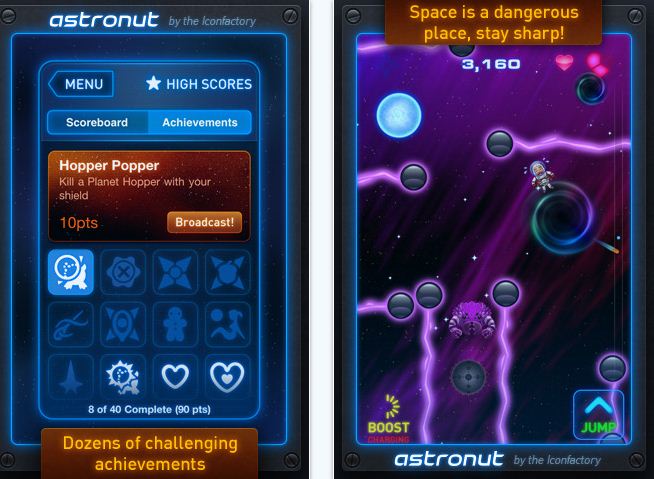 Astronut è un gioco di cui vi abbiamo già parlato qualche giorno fa, sviluppato da The Iconfactory, in cui impersonifichiamo un astronauta che viaggerà per galassie e pianeti cercando di sopravvivere agli attacchi alieni.[appscreens 336015305]