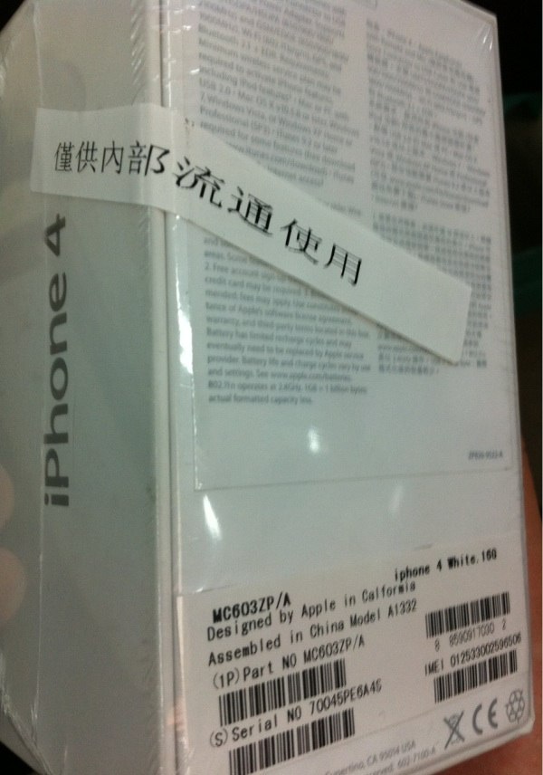 Nella seconda foto si nota invece chiaramente la scritta iPhone 4 White, oltre a un’etichetta (di cui tutti gli iPhone in questione sono provvisti) che recita la scritta “solamente per uso interno”. Quindi, se questi rumors dovessero rivelarsi veritieri, gli iPhone bianchi in commercio sarebbero stati rubati ad Apple.