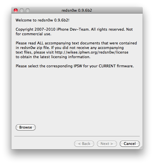 2. Avviate RedSn0w 0.9.6b4 e dalla prima schermata selezionate il file .ipsw relativo al firmware 4.2.1 cliccando sul tasto browse; dopo che il programma avrà identificato il firmware ed inizierà un breve processo (è richiesta la connessione ad internet). [PER UTENTI WINDOWS: Per evitare problemi avviate il programma in “Modalità Amministratore” cliccando con il tasto destro del mouse sul .exe]
