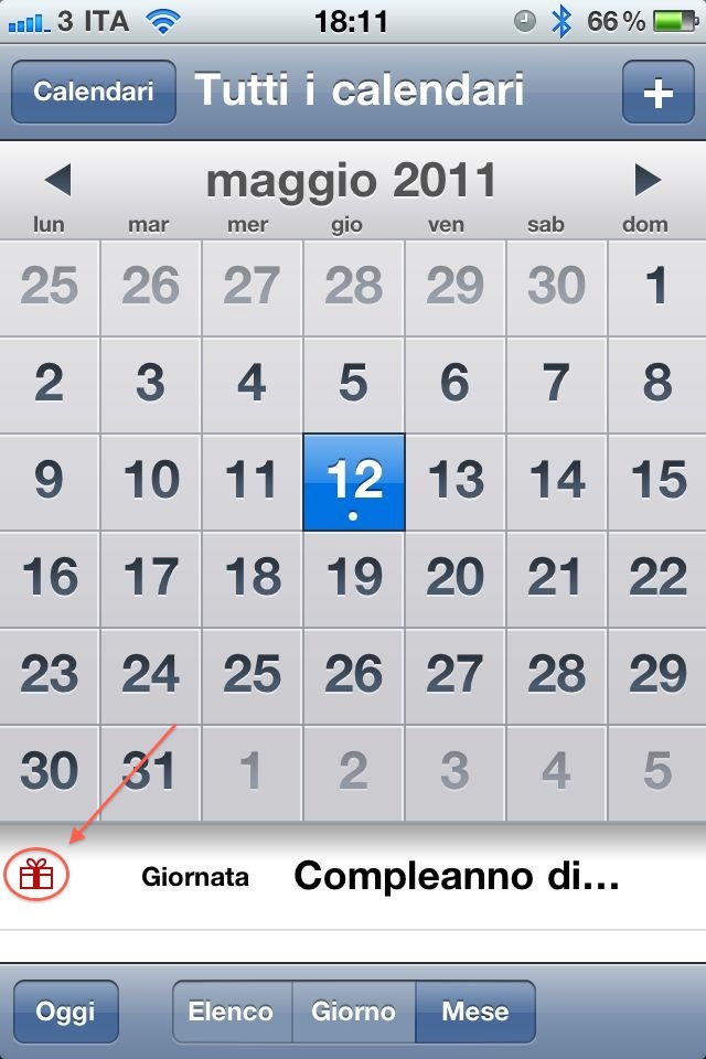 Partiamo dall’applicazione Calendario. Probabilmente, chi tra di voi utilizza il calendario per organizzare anche i compleanni di amici e conoscenti, avrà notato questa differenza. Con il firmware 4.1, quando si inseriva un compleanno nel calendario, veniva considerato come un qualsiasi altro impegno. Con iOS 4.2.1, Apple ha modificato l’icona dell’impegno, trasformandola in un pacchetto regalo (Tuaw). In questo modo potremo velocemente riconoscere un compleanno dagli altri eventi.