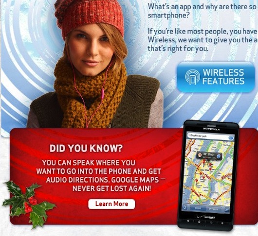 Senza in alcun modo citare Apple, Verizon ha inserito nel suo volantino di Natale una foto del Motorola Droid X con lo screenshot dell’applicazione Mappe di iOS. Nelle due immagini che seguono potete vedere l’interfaccia di Google Maps sul Droid X (prima immagine) e su iPhone (seconda immagine).