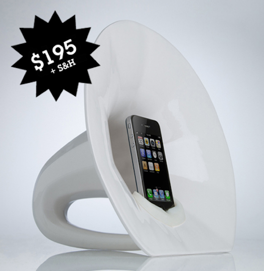 Con questo accessorio, realizzato interamente in ceramica, potrete amplificare il suono del vostro iPhone fino a 4 volte, senza bisogno di alcun tipo di elettricità. La cassa armonica a forma di fonografo, infatti, amplificherà direttamente il suono proveniente dall’altoparlante.
