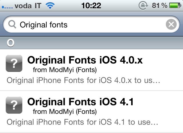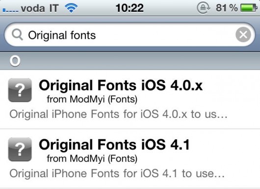 - Per prima cosa aprite Cydia e scaricate il pacchetto “Original Fonts iOS 4.0.x” (o 4.1 se avete iOS 4.1)