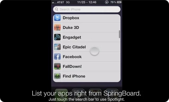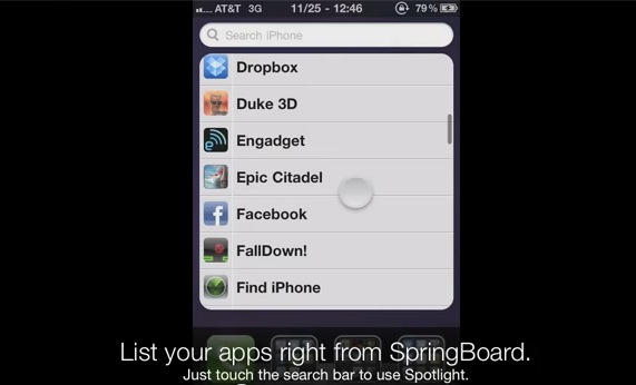 Semplicemente spostandoci nello Spotlight nativo, anzichè trovare la pagina completamente vuota oltre il box di ricerca, troveremo anche la lista completa delle applicazioni installate sul nostro iPhone/iPod Touch e potremo farla scorrere fino all’applicazione che desideriamo, anzichè girare le varie pagine della SpringBoard stando attenti alle varie Folders e così via.