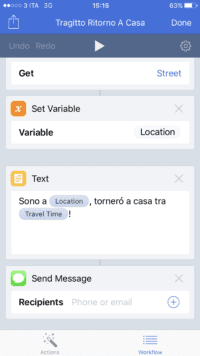 Ad esempio, con la semplice pressione di un tasto, possiamo far partire l’applicazione Mappe, che calcolerà la distanza in termini di tempo tra la nostra posizione attuale e la nostra abitazione. Questa distanza verrà archiviata in una variabile interna di Workflow per poi essere ripresa in automatico dall’applicazione Messaggi, che creerà un messaggio del tipo “Sono a X, arriverò a casa tra Y minuti”, dove la “X” rappresenta la mia posizione attuale, mentre “Y” la variabile appena salvata.