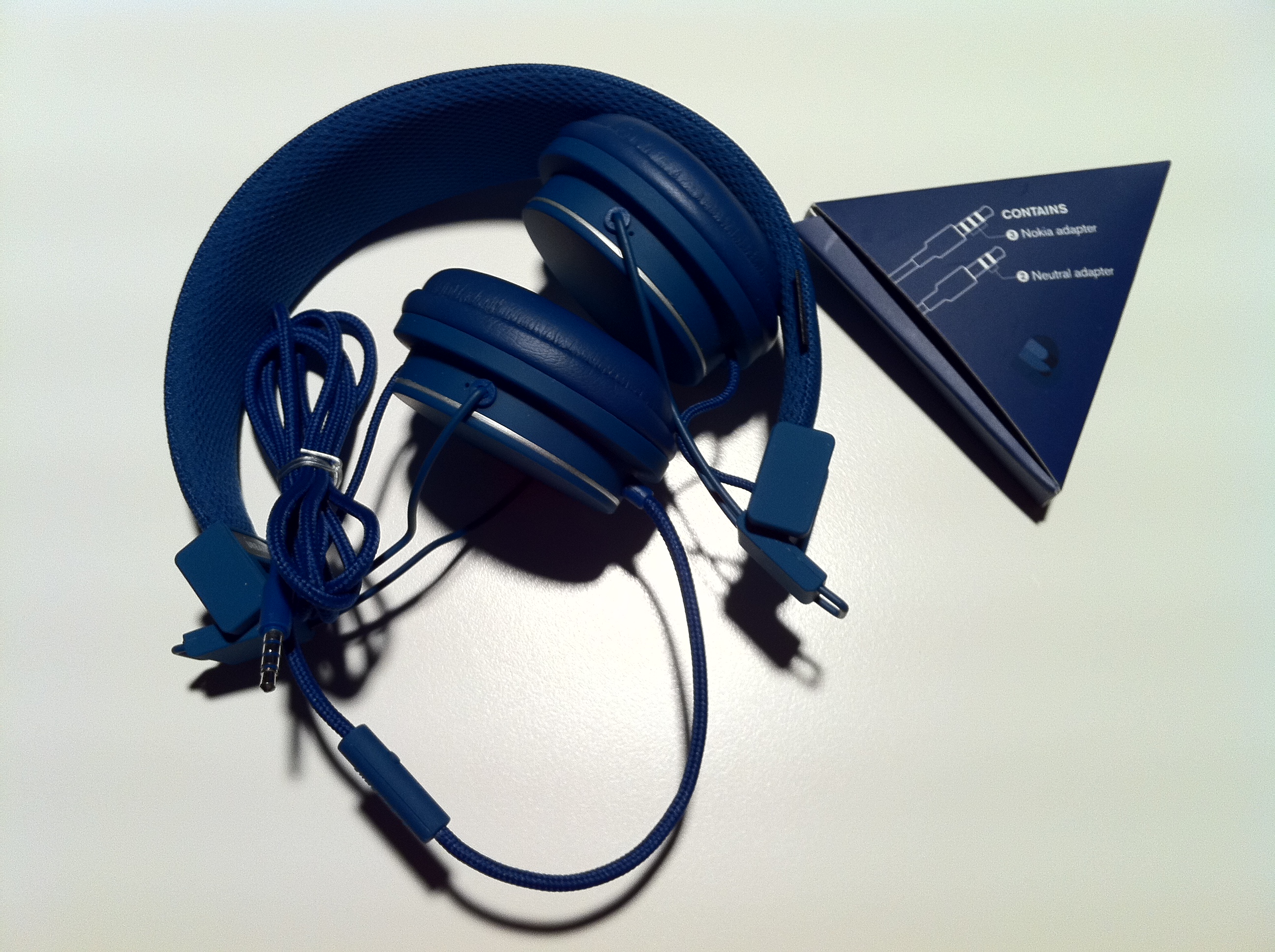 Le cuffie sono ripiegate su loro stesse seguendo il disegno triangolare dell’interno della confezione. Troviamo, oltre alle cuffie con jack audio standard, una brochure indicante i vari altri modelli e un’altra piccola scatola triangolare contenente un estensione jack per rendere l’Headset compatibile con i device Nokia e un’estensione per un jack stereo di vecchia generazione.