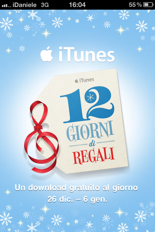 Come ogni anno dal 2008, Apple pratica la sua promozione di Natale sull’iTunes Store. Ogni giorno, dal 26 Dicembre al 6 Gennaio, gli utenti avranno un regalo scaricabile gratuitamente da iTunes.
