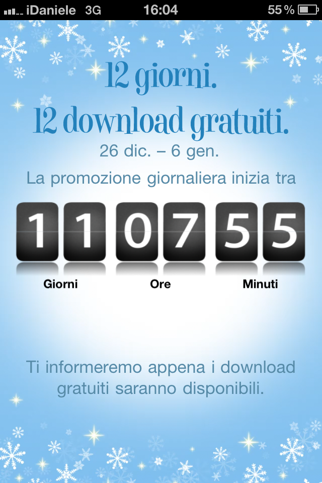 L’applicazione ci segnalerà tutti i giorni in Push la sorpresa selezionata da Apple, in modo da restare sempre aggiornati con i vari regali. In questo momento aprendo l’applicazione troveremo il countdown al via dell’iniziativa. L’applicazione è Universale e potremo installarla anche su iPad.