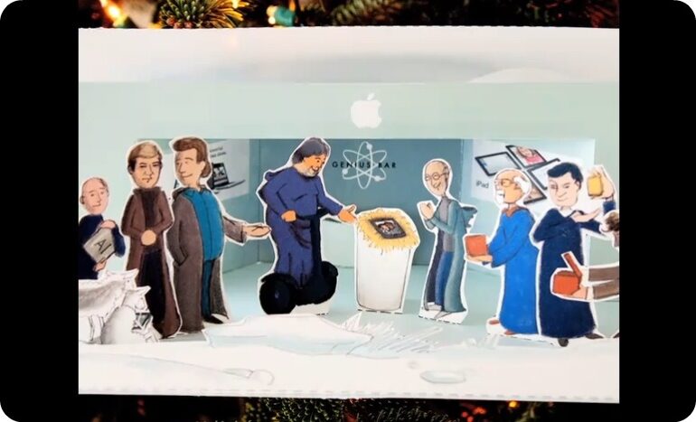 Come se non bastasse, eccovi un video nel quale ci viene mostrato come realizzare questo particolare presepe, dove ormai la vecchia grotta è fuori moda e viene sostituita con un bianco e scintillante Apple Store: