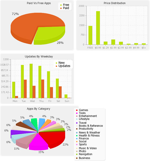 La crescita è considerevolmente più veloce di quella che Apple e Google hanno visto nei primi giorni dei loro store, anche se Microsoft è stata aiutata dall’aver rilasciato il suo Mobile Apps due anni più tardi e da un mercato in generale più aperto alla categoria smartphone. Come possiamo vedere dai grafici postati sopra, circa il 72 percento delle applicazioni Microsoft sono a pagamento, ma le statistiche confermano che l’azienda si sta muovendo verso un prezzario simile a quello dell’iPhone dato che una chiara maggioranza delle apps costano 99 centesimi o sono gratuite. I giochi sono ora molto più importanti e compongono il 22 percento dello store del Windows Phone 7, mentre erano molto meno rappresentati su Windows Mobile.
