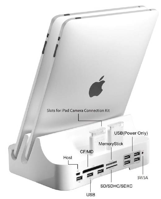 L’iPADock però non è solo una stazione di ricarica e sicronizzazione per iDevice, in quanto può essere utilizzata anche come multicard reader per schede CF I / CF II / CF 3.0 / MS / MS PRO / MS DUO / MS PRO DUO / M2 / SD / MINI SD / SDHC / SDXC / micro SD(T-Flash), permettendoci di leggerle con i nostri PC/Mac.