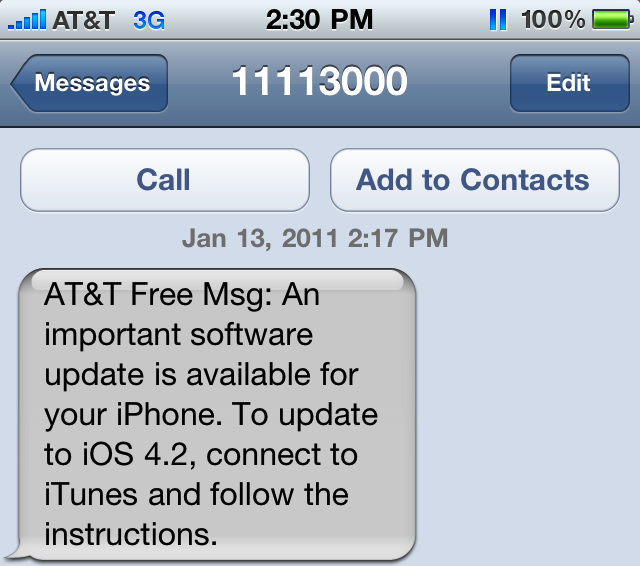 Come spesso accaduto con gli aggiornamenti di iOS, l’operatore telefonico AT&T sta inviando SMS ai propri clienti, incoraggiandoli ad aggiornare ad iOS 4.2. Tramite un tweet dall’account ufficiale del Dev-Team arriva un avvertimento: gli utenti in possesso di un iPhone straniero (e che necessitano quindi dell’unlock della baseband) non devono assolutamente aggiornare il firmware!