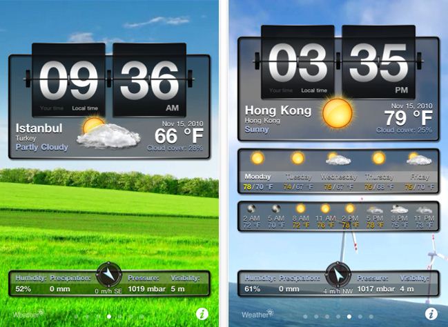 L’applicazione mette a nostra disposizione le condizioni meteo in tempo reale e una previsione per 5 giorni di tutte le stazioni meteo del mondo. Le informazioni sono visualizzate attraverso bellissimi video loop a schermo intero per tutte le condizioni. Tutto ciò unito a Flip Clock e a World Clock, in modo da trasformare i nostri iDevice in stazioni meteo complete.