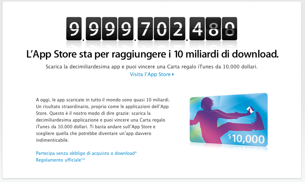 “L’App Store sta per raggiungere i 10 miliardi di download”, è questa la frase che possiamo leggere dal sito Apple relativamente al numero di download ottenuti grazie alle applicazioni dell’App Store.
