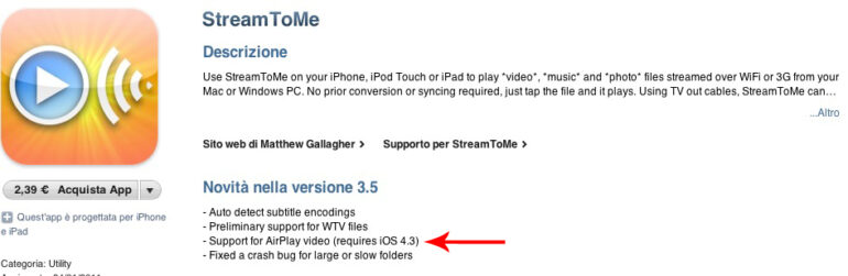 L’applicazione in questione è StreamToMe (link AppStore) che, come potete vedere dall’immagine sovrastante, è stata recentemente aggiornata introducendo la compatibilità all’AirPlay Video (una caratteristica che verrà introdotta con iOS 4.3).