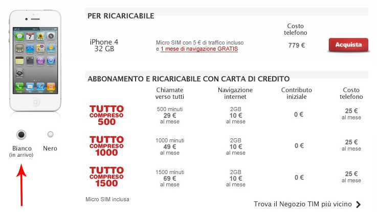 Dopo essere apparso nei sistemi di vendita di tantissimi gestori telefonici in tutto il mondo, l’iPhone 4 bianco è comparso “come per magia” anche nel sito di TIM.